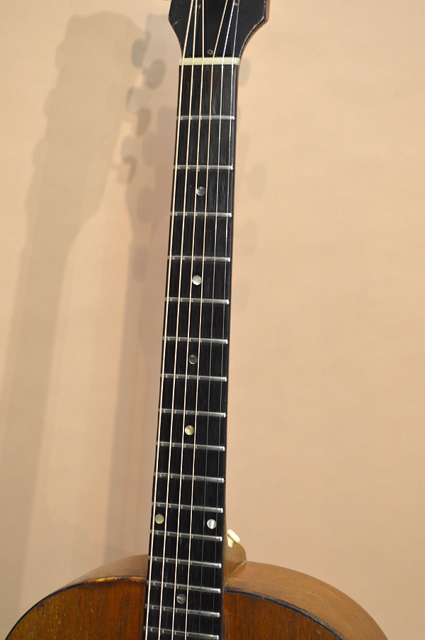 そのサウンドはマホ・ボディー&ラダー・ブレーシングならではのブルージー且つ可愛らしくカラコロと鳴る軽快なサウンド!マホ特有の柔らかい音の立ち上がりに嫌みの無い素直なサスティーンで、何とも癒されるサウンドです。フラットピックで掻き鳴らせば、ギブソンらしい荒削りな一面も顔を覗かせますが、やはりフィンガーで爪弾いた時の癒し系ポロロン・サウンドが何といっても秀逸です!サスティーンはそんなに長くありませんが、この短いサスティーンを伴ったウクレレちっくなポロロン・サウンドこそがLG-0の持ち味でしょう!あくまでもオール・マホの軽やかなサウンドですが、プラ・ブリッジに比べるとやはり音の密度が高く、おもちゃっぽさはあまり感じません!