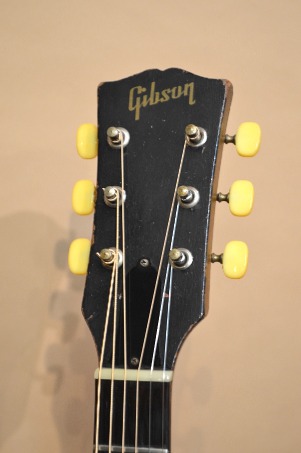 マホガニーTOP、マホガニーSIDE&BACK、マホガニーNECK、ハカランダ指板&ブリッジ、ハカランダ・アジャスタブル・サドル、ラダー・ブレーシング、実測40.4mmナロー・ネック、24.75インチ・スケールの14 1/8スモール・ボディー。LG-1やLG-0は基本プラスティック・ブリッジが標準仕様ですが、60年代後期になってくると、木製ブリッジや今回入荷の個体のようなアジャスタブル・ブリッジ仕様のモノがちょこちょこ見られます。サウンドは好みでしょうが、B-25用のアジャスタブル・ブリッジが流用されていると思えばちょっとお得感がありますね(笑)!