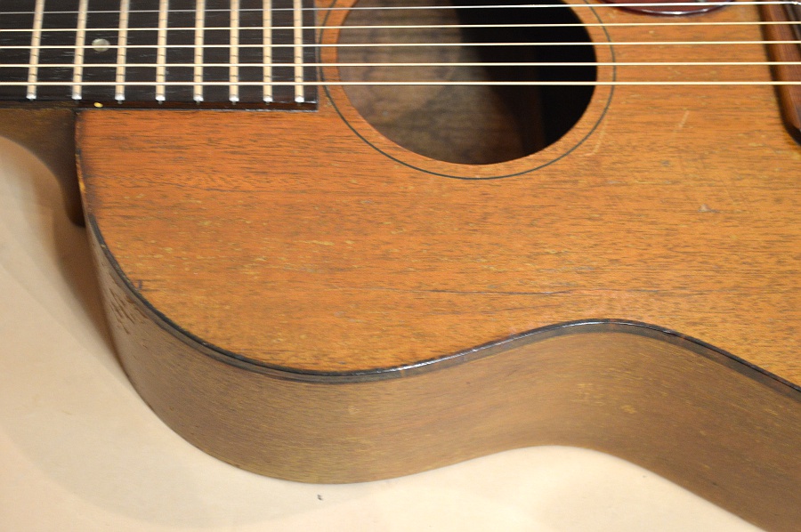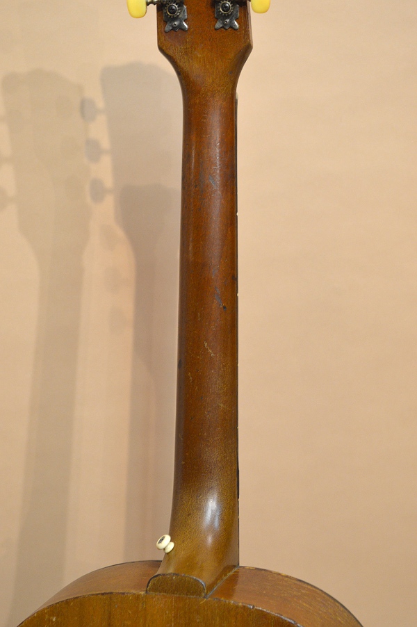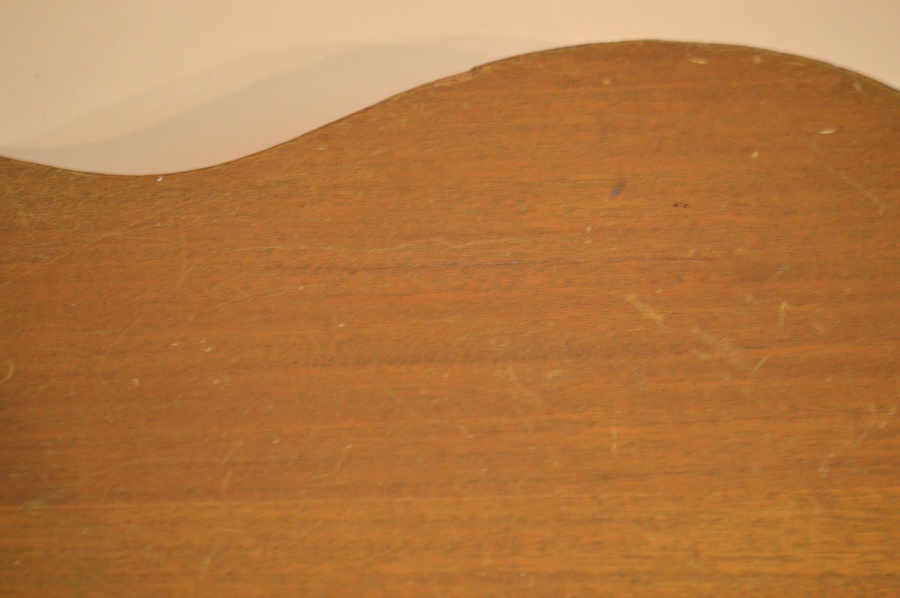 楽器のコンディションはいくらかの修理歴がありますが、年式の割には綺麗なコンディションです!修理歴としては複数本のクラック・リペアーがあります。まずトップの6弦側指板脇に7cmほどのクラック、6弦側ウエスト部に10cmくらいのクラック、バックのセンターから6弦寄りの箇所に10cm強のクラック・リペアーがあります。それぞれしっかり接着され補強のクリートも打たれていますので、今後お使い頂くのに強度的な不安はありません。トップ側のクラックは黒っぽい筋に見えやや目立ちますが、バックの方は杢目に隠れてそんなに目立ちません。べっ甲柄のバインディングは所々変色していますが、崩壊しそうな程でもありませんので、今後もこの状態を維持していくと思われます。その他にもガリガリとやったキズやヘッド部角の潰れなどもありますが、キズに関しては年式なりか年式の割には少ない方かと思います。過去にPUを搭載していたようで、エンドピンはオーバー・サイズの物にリプレイスされています。