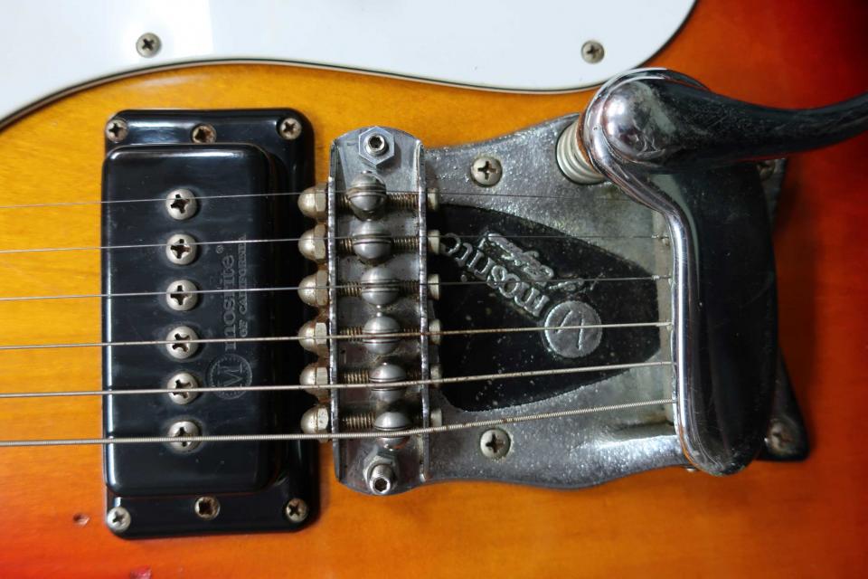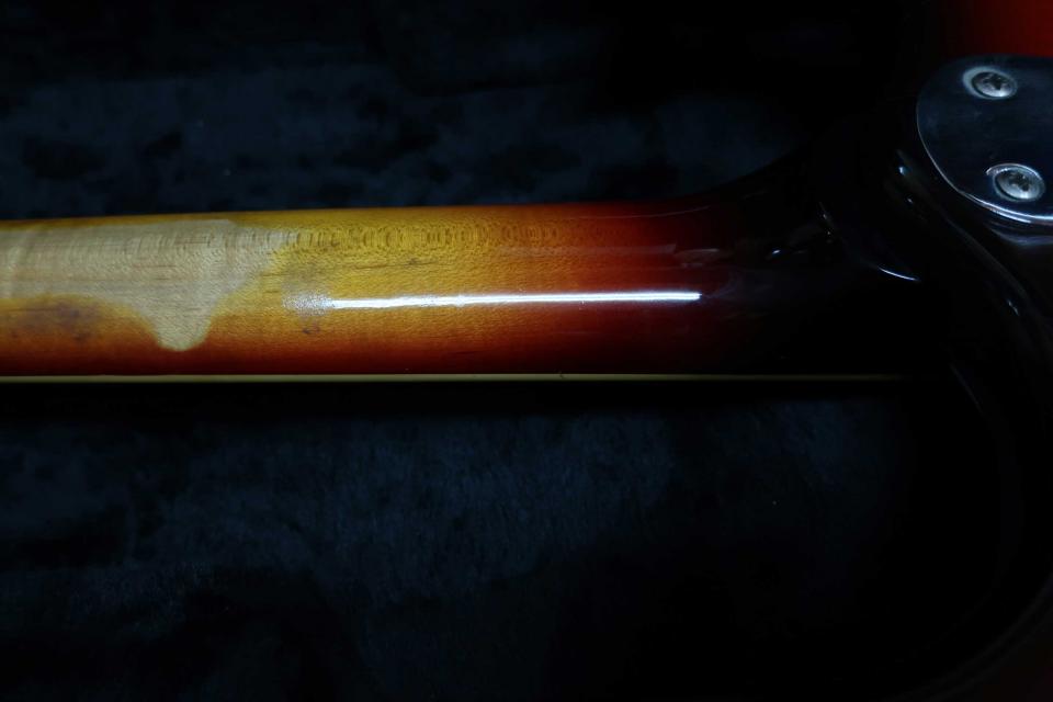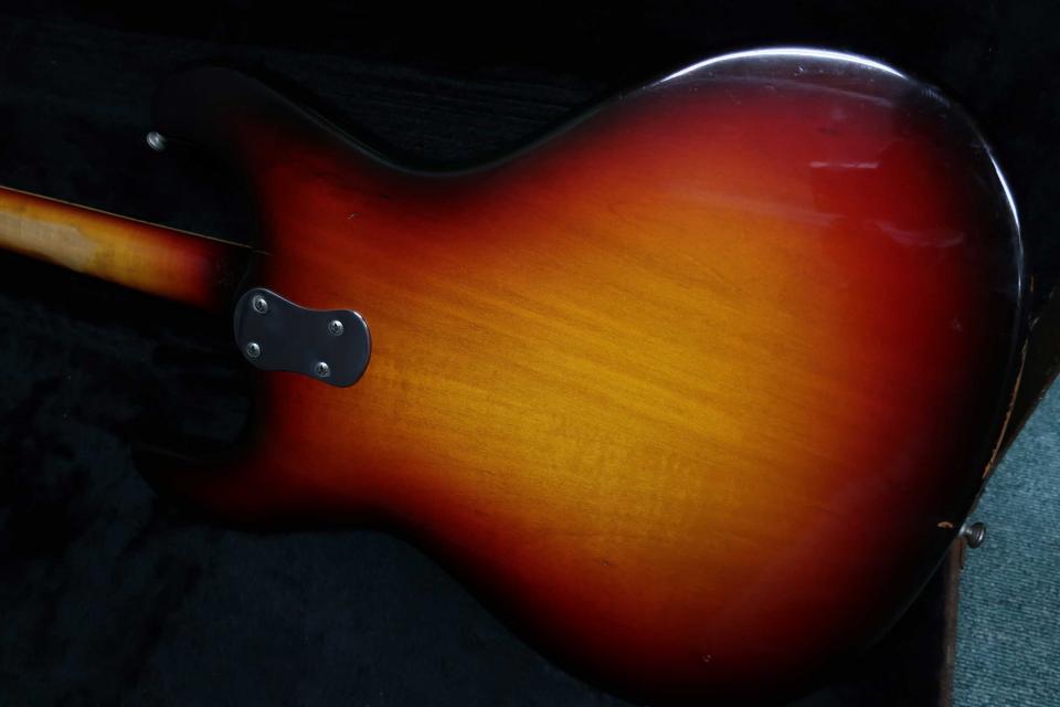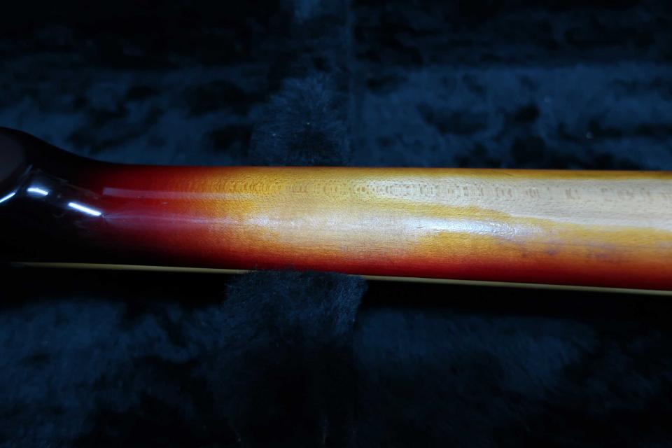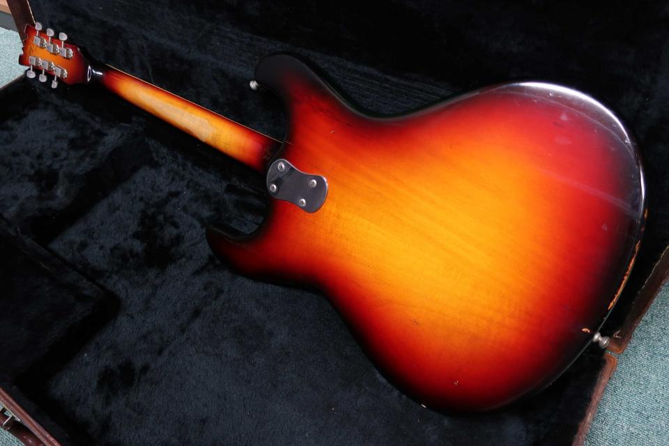 ボディは軽量バスウッド(3.3kg)、ヘッドには、6X6クルーソンタイプ・ペグ、0-フレット、ブラスナット、mosrite刻印入りピックアップ、指板ローズウッド、ヴィブラート・ユニットが採用され美しいスリートーン・サンバーストで仕上げられた逸品です。ヘッド裏には製造年と稀少なモズレー氏のサインが確認できます。