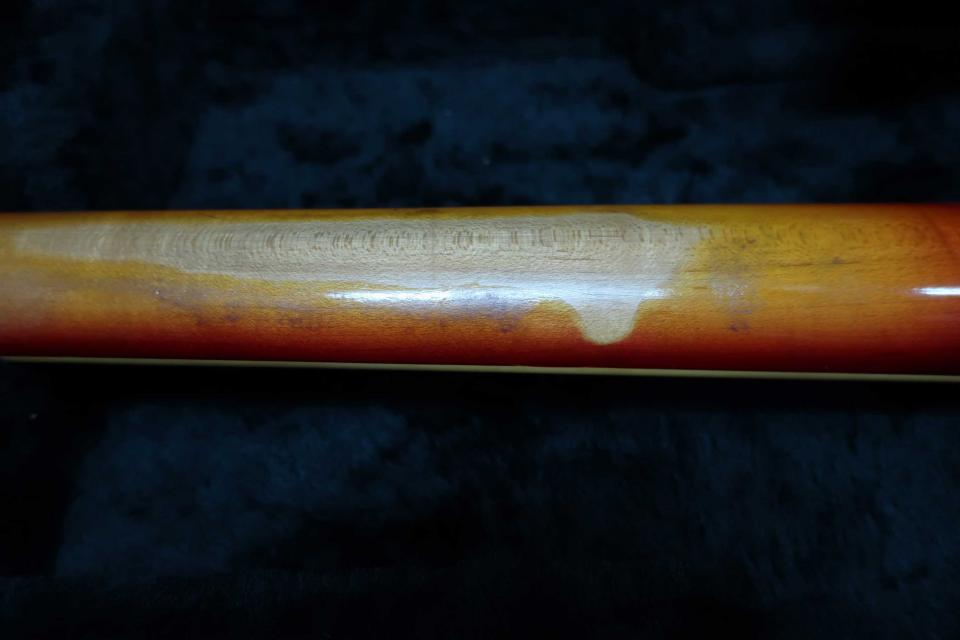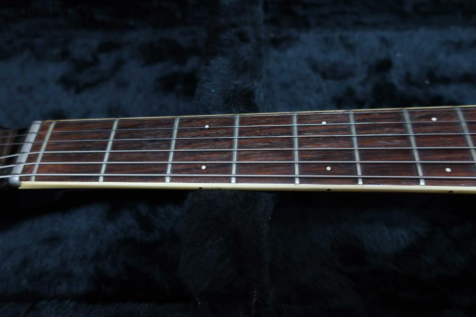 状態はボディエンドに塗装が薄くなっている箇所とリアピックアップの6弦側に打痕とトップ左の右手の肘が当たる歌唱に小さな打痕が有りますが、バックは4~5個程度の打痕とネックヒール横に塗装のヘアーラインチェッキングが見られますが表面的な感じで強度など問題なと思います。ネック裏は年代なりの使用感があり塗装が薄くなっております。0-フレット仕様、ナット幅も約40mmと弾き易くブリッジも可変式でベタベタの弦高も簡単に調整可能です。オリジナル・アリゲーターケースも付属しています。現状販売ですが中古市場でも玉数の少ない価格も含め稀少なお買得品です。