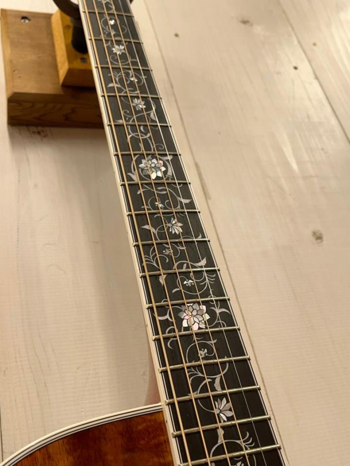 指板に豪華なグラスフラワーインレイを施したカスタムモデル。