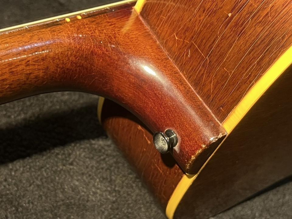 ブリッジ両脇にダボ跡あり。トップセンターに割れの修理歴がありパッチ処理がなされています。ピックアップをインストールしていた形跡としてエンドピンがコンバージョン用の木製タイプに換装されています。ネックヒール上部にボディに対し垂直にストラップピン増設済。