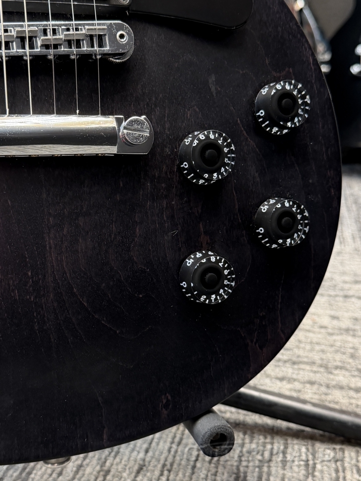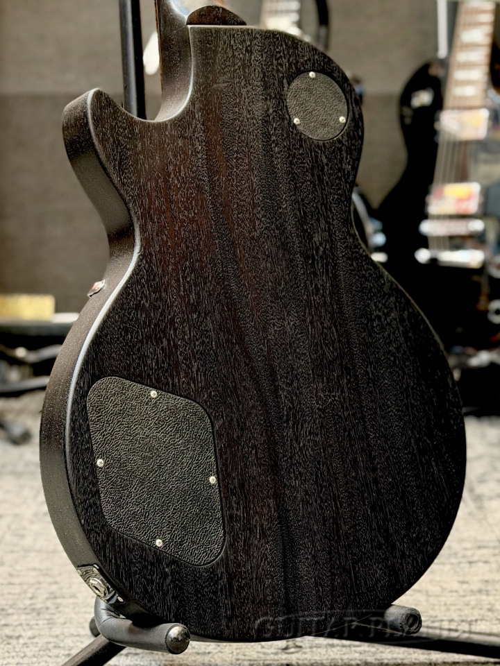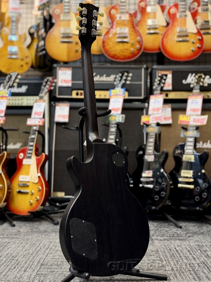 木目の透けたブラックのフィニッシュがクールな、お手頃価格で本格レスポール・サウンドをご体感いただける個体です。どうぞお見逃しなく!