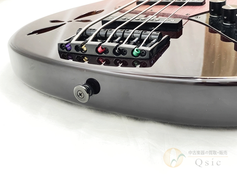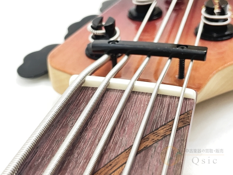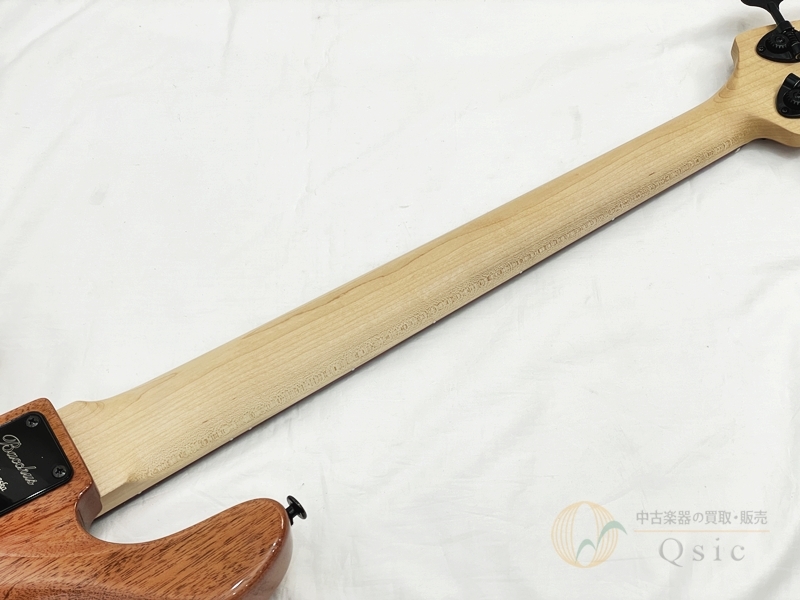 ボディ材の桜とベース材としては珍しいアフリカンマホガニーの組み合わせに、メイプルネックとパープルハート指板を採用。