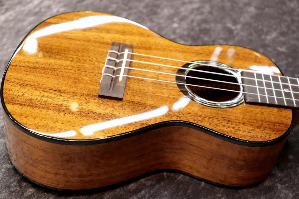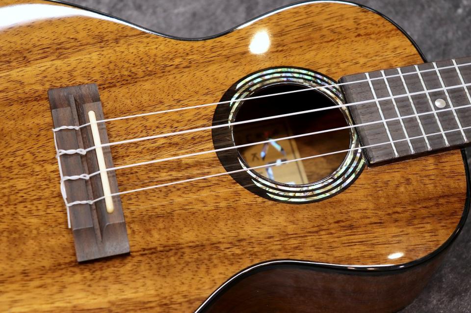 美しい光沢を持つ艶あり仕上げのモデルで、透き通ったサウンド。ハワイアン・コアの木目やアバロン貝のインレイがさらに輝き、ゴージャス感があります。