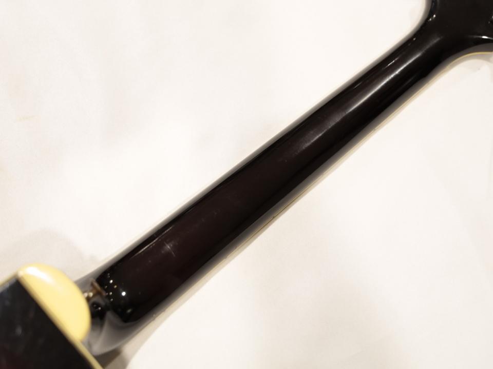 ピックガードにテープ痕があり、ボディバック表面の線傷が黒ずんだ形跡があり、擦れ傷やこまかな線傷も目立つなど使用感がございます。