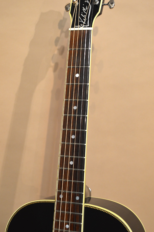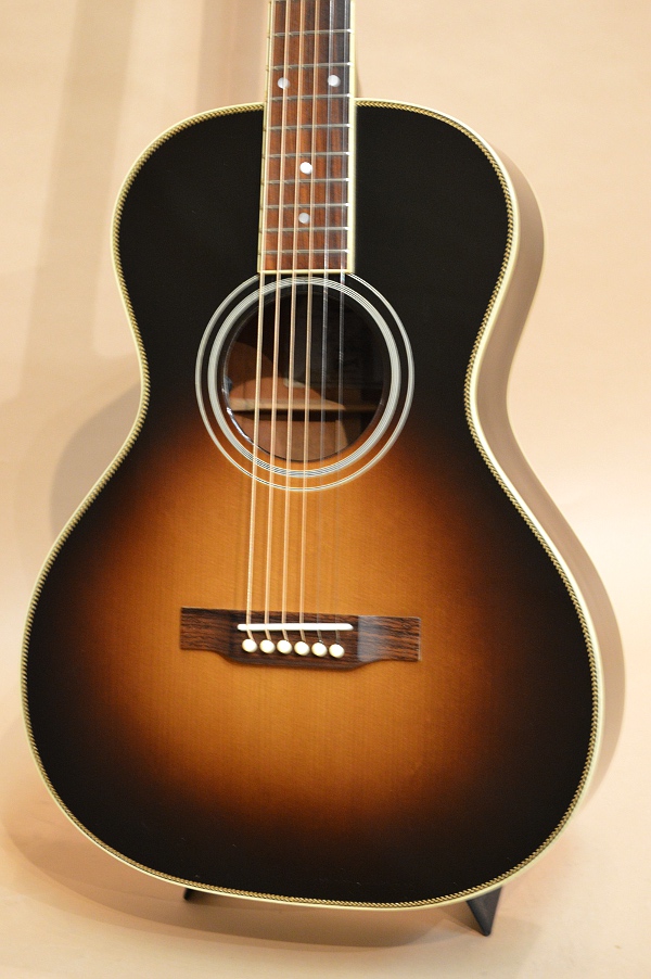 ナット幅は約46mmと少し広めで、スケールも25インチ・スケールと、J-45なんかよりほんの少し長めのスケールです。ボディーはコンパクトで抱え易く、演奏性は良いですが、アディロンTOPや太めのグリップ、12フレット・ジョイントなど様々な要素に因り、出音は非常に太く存在感の有るサウンドで、見た目の印象より太くラウドに鳴ってくれます!フィンガーでの反応の良さや倍音感は言うまでも無く、フラット・ピックでストロークしても16インチ・ボディーに負けないくらいのパワー感が出ますので、フィンガー・ピック・ブルースのみならず、あらゆるスタイルのプレイに対応出来るオールマイティーなサウンドかと思います!また、こちらのモデルにはデフォルトでL.R.BaggsのエレメントPUがインストールされていますので、ライブやレコーディングにも即対応可能です!