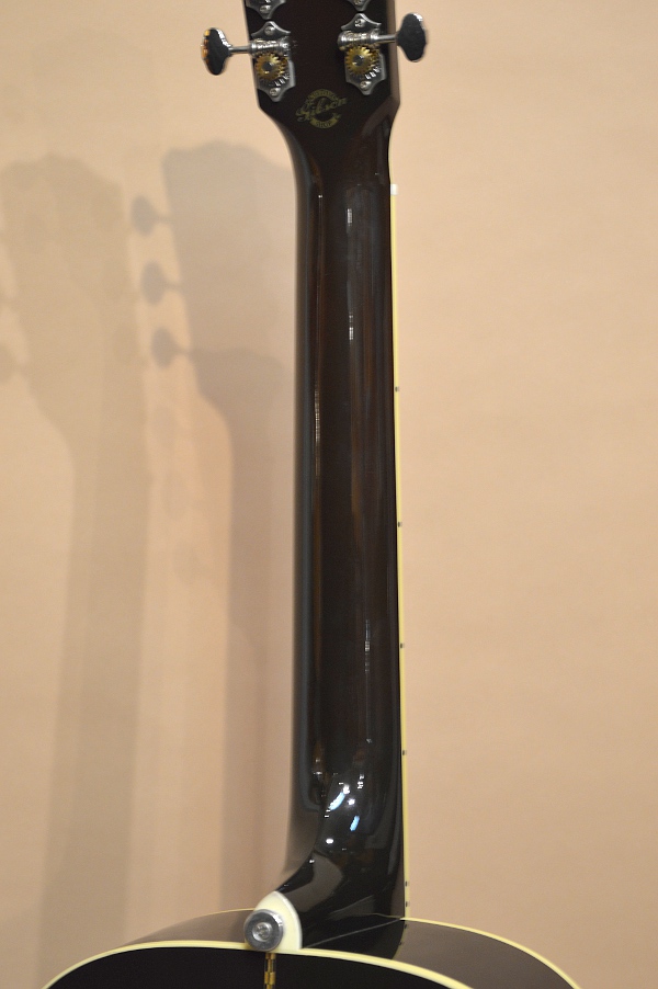 楽器のコンディションは、小キズこそ散見出来ますが、遠目にもド派手に目立つキズも無くまずまずの美品コンディションです!唯一ボディー・エンド部を強打したのか?6弦側のサイドの膨らみ部下部に6cmくらいのヘアライン・クラックを修理した跡があります。丁寧に修理されていて、内部からは補強のクリートも打たれていますので、今後お使い頂くのに強度的な不安はありません。その他にはトップにはポツポツと打痕が散見出来、サイドやバックにはちょっとした擦り傷が数本見つかりますが、ほとんどのキズが光の反射で見なければ気付かないようなモノばかりですので、15年使い込まれて来た楽器として見て、取り立てて大騒ぎするほどのキズは無いかと思います。ボディー内に貼られたインナー・ラベルは何か染みてるのかと思いましたが、、よくよく見るとこういう柄のペーパーラベルのようです。右側にある丸いシミだけが後から付いた汚れのようです。因みにこのペーパーラベル、2011年の途中から普通のオレンジ色のオーバル・ラベルに変わるようなので、今回入荷の個体はかなり初期の物と思われます。また、ネック・ブロックに付いていた電池BOXの接着力が無くなってしまったようで、電池BOXはバック板の2番目と3番目のブレーシングの間に移設されています。