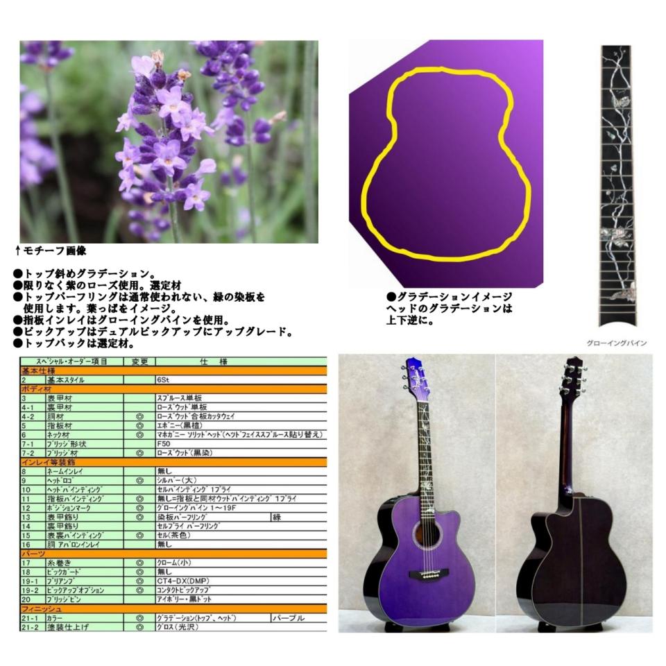 生産数1本! ラベンダーをモチーフにした特注品。工場選定ローズウッドと、マッチング度合の高い美しいグラデーション! 更に指板には豪華なグローイングバインインレイ!