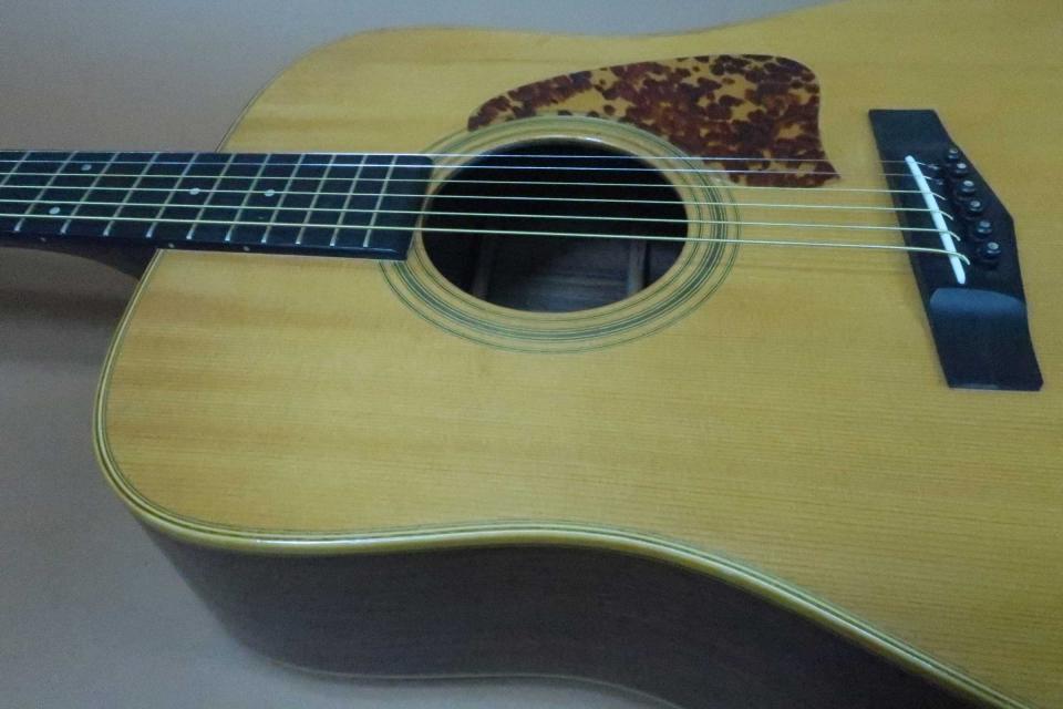状態はピックガード周りに薄くスクラッチ傷とブリッジの1弦側に目立たない打コンは見受けられますが、パッと見は目立つ酷いダメージや木部のクラックなどは見受けられません。サイドも小傷と小さな打コンは見られますが酷いダメージもなくバックもボディー左下に線傷と小さな当て傷ぐらいで年代を考ええれば美品を保っていると思います。ネック裏も軽微な線傷と8F裏に打コンは見られますが凄く気になるダメージでは無く演奏性も問題はないと思います。弦長約641mm、ナット幅約43mm、弦高は12F6弦約2.mm、1弦約1.5mmと弾きやすい調整がされており、トラスロッドはナット下に有り鉄棒をロッドの穴に差し込んで回すタイプですが現在はナットは固定されておりますが、ネックの元置きなども見られずネックを含めプレヤビリティも良好です。当時の汎用ハードケースも付属しています。中古市場でも滅多に出ない稀少モデルです。是非この機会にコンプリートして下さい!
