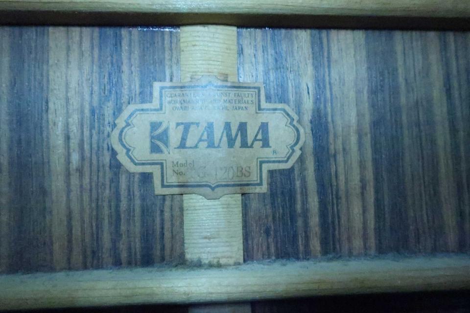 希少なレア・モデル、TAMA TG-120BSの入荷です!本器は中古市場でも滅多にでないジャパン・ヴィンテージの銘器で自然素材にこだわり、トップには杢目も素晴らしいセレクト・ジャーマン・スプルース単板、サイド&バックには杢目の詰まったセレクト・ローズウッド単板が採用され、ヘッドにはT-インレイロゴ、グローバー102ペグ、エボニー指板&ブリッジ、マホガニーネック、塗込み本べっ甲ピックガードにメイプル・ウッドバインディング、ウッドブリッジ・ピンとルックスはシンプルですが製作の作り込み精度や質感の良い仕上げは流石です!サウンドは、独自の変形Xブレイシングとファンブレイシングの組み合わせが採用され、箱鳴りする野太い低域に歯切れの良い中域と煌びやかで艶やかな倍音豊かな高音域の鳴りは驚きです。
