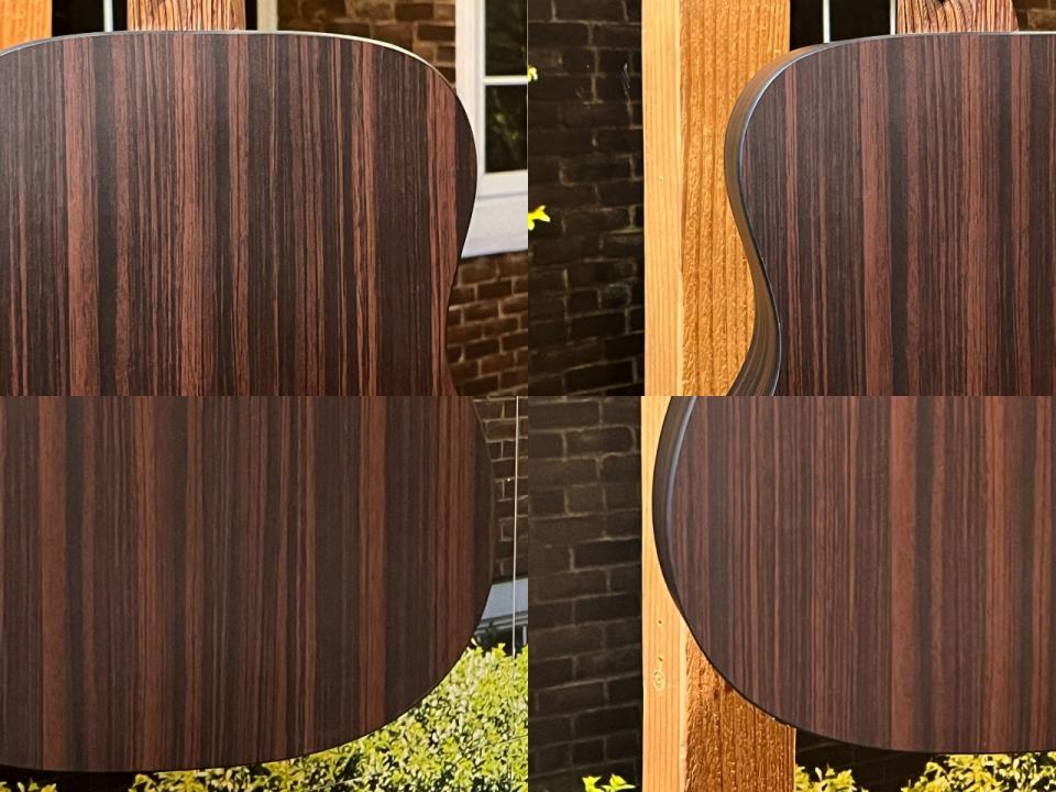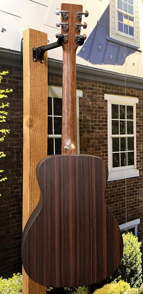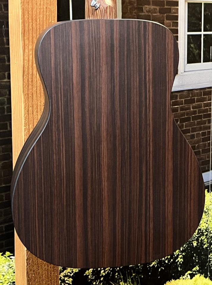本器LX-1REは仕様がボディトップスプルース単板仕様、サイド&バックにはローズウッドパターンのHPL(ハイプレッッシャーラミネイト)を採用。大きなサイズのギターではサイズ的に使用の難しい木材を圧縮し、板状にし使用する事で木材の無駄を無くし、また木材が枯渇し始めている今、非常に注目すべき素材です。