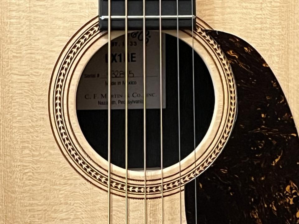 表板にはピックガードを標準装着し、レーザー加工によるサウンドホールのヘリンボーンロゼッタも特徴的です