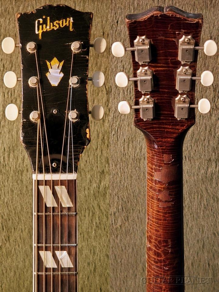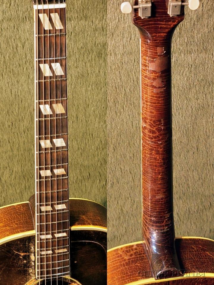 サウンドホールの演奏に伴う木部欠け、全体のウェザーチェック(部分的に塗装剥離有り)、指板の押弦跡、割れなど弾き込まれたヴィンテージならではのルックスです。
