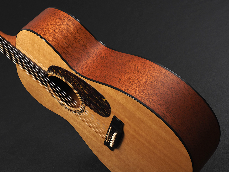 トップにはスプルース単板、サイド&バックにはマホガニー単板を採用。立ち上がりの良いクリアなアタックと、芯のあるミッドレンジ、そしてトリプルオーサイズならではの繊細でバランスの取れた響きが魅力です。ストロークではまとまりのあるコード感を、フィンガースタイルでは粒立ちの良いきらびやかなサウンドをお楽しみいただけます。