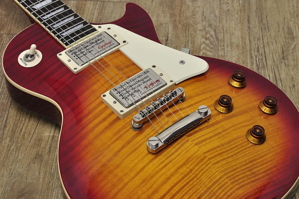 レスポールらしいシングルカッタウェイのボディシェイプに、バインディングが施された上品なルックスが魅力で、フレイムの表情が映えるサンバーストフィニッシュも存在感のある仕上がりです。