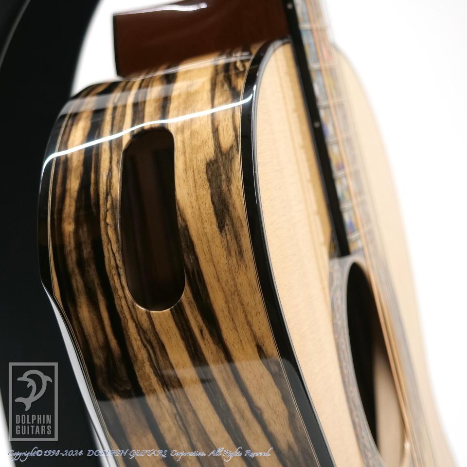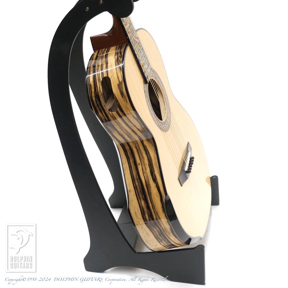 インレイに目を奪われますが、もちろんギターそのものも世界で高く評価されています。トップにはラスキン氏お奨めの最高グレードのスプルース、そして、サイドバックにはブラック&ホワイトのコントラストが美しい、黒檀の希少種、ムンエボニーを使用しております。