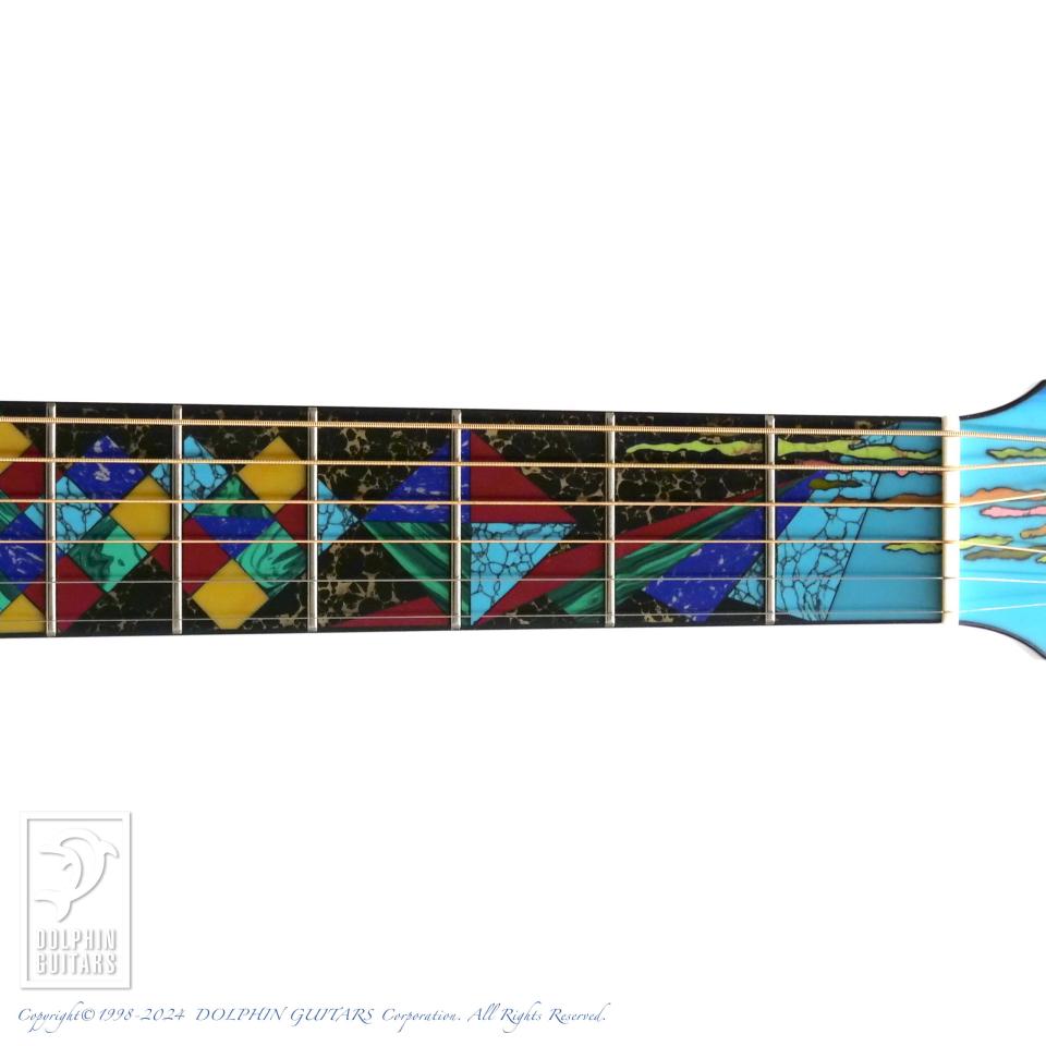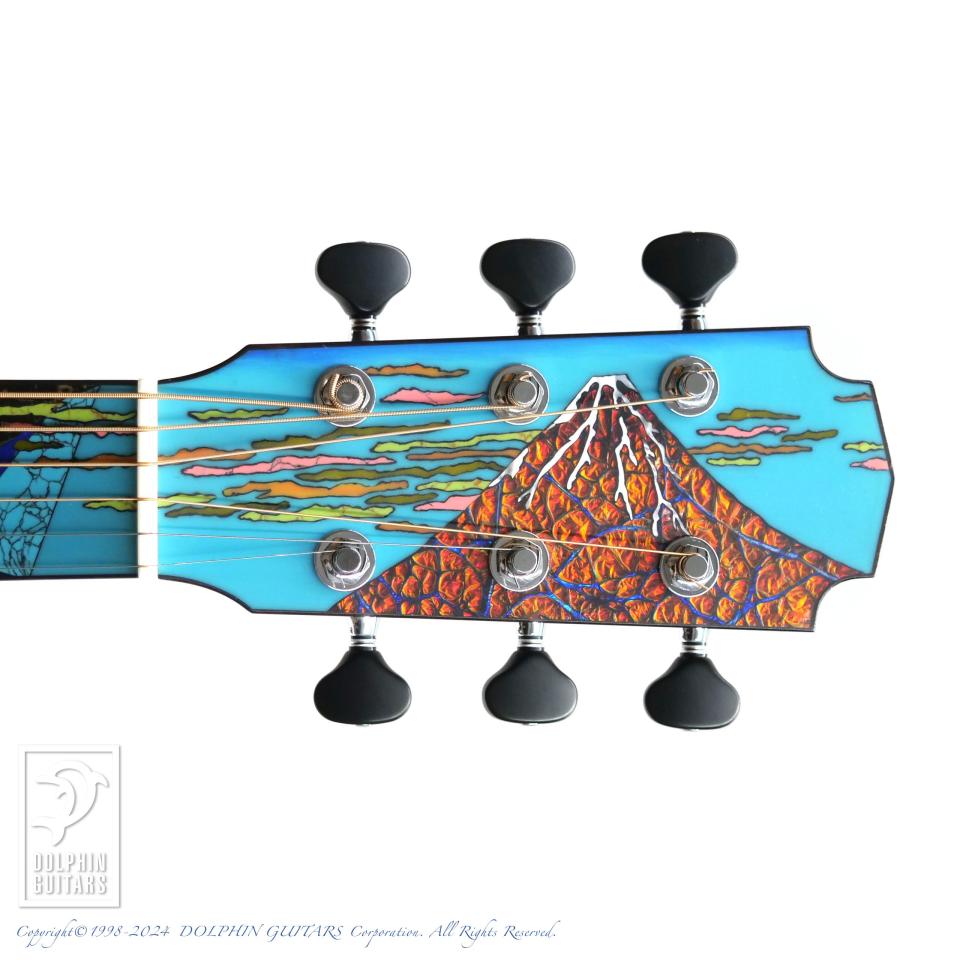 説明不要の魅力を放つ本器、ギター界一アーティスティックと言っても過言ではないほど、見るものを圧倒します。富嶽三十六景全46図中、世界的にも認知度の高い名品『神奈川沖浪裏』と『凱風快晴(通称:赤富士)』がギターを版に描かれております。この鮮やかな色使いは氏の十八番であり、誰よりも早く様々な素材を重ね独特の世界観を作り上げてきました。