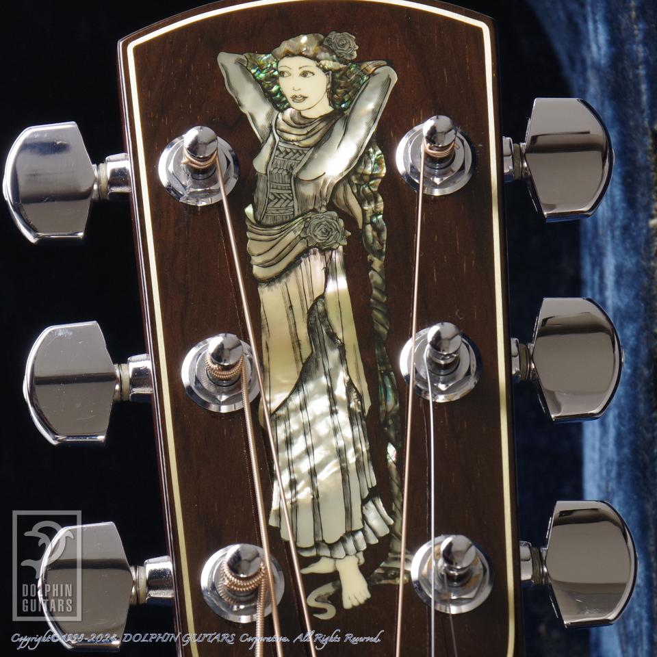 ヘッドの"ローズレディ"インレイ、指板のトーチインレイなど煌めくアバロンの散りばめられた美しい一本。