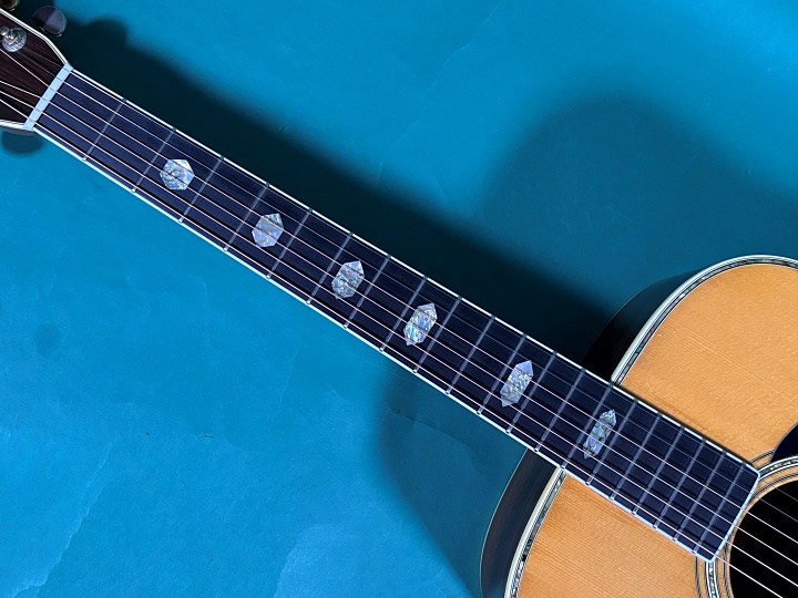 41スタイルのソリッドアバロンインレイで、ラミネイトの新しいものよりも渋い輝きが特徴です。