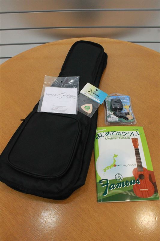 国産ウクレレの老舗ブランド、Famousのお買い得ビギナーズセット!ソフトケース、ウクレレ用チューナー、教則本、ウクレレ弦、ピックが付属してこのお値段!