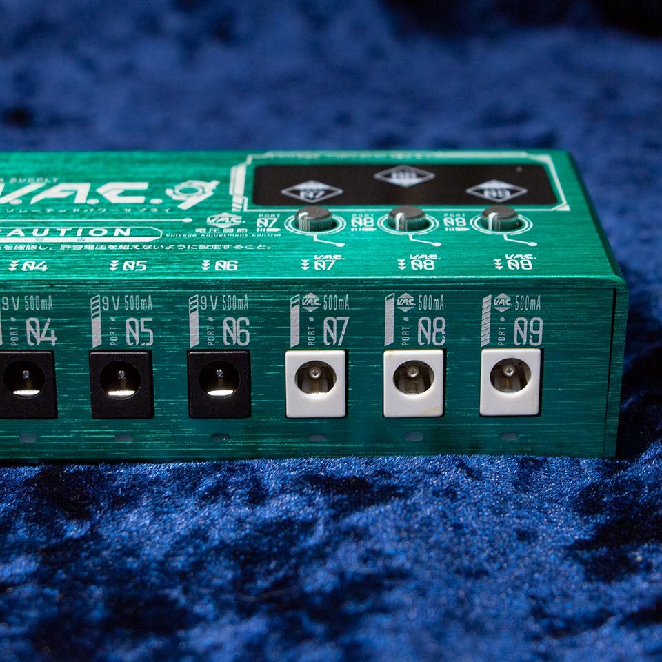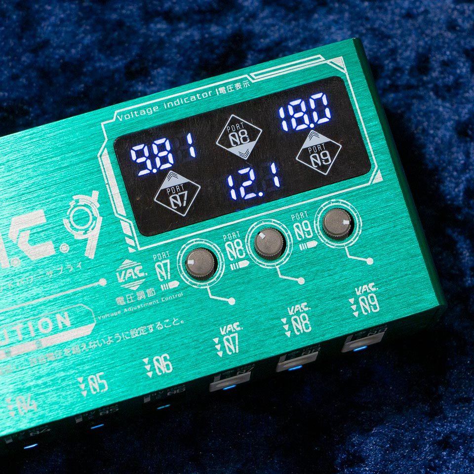 電圧をコントロール可能なボルテージアジャスト機能搭載のポートを3つ、無負荷時供給電圧を約9.8V(最適環境下において)のポートを6つの全9ポートを持つパワフルで高機能なパワーサプライです。グラウンドまで完全に個別にしたフルアイソレート回路です。Port1-6 は無負荷時供給電圧を約9.8V (最適環境下において)に、高負荷時でも9.4V を確保出来るよう設定。特にDistortionやOverdrive系のペダルで音に張りと厚みが生まれ、ブライトネスも上がる効果も期待できます。ボルテージアジャスト機能により6.5V~18V 間を無段階で 任意の電圧に設定可能(Port7-9)(電流も可変となります。目安として12V時 375mA 18V 250mA)。また、ボルテージインジケーターにより設定電圧を見える化。これらの機能により電圧が低めの電池をわざわざ用意して行っていたFUZZ への低電圧供給も持続可能になりました。小型のファンを搭載し、サイドから空気を取り込むことで冷却性能を飛躍的に向上させました。熱損失を最大限に減らして電力効率の上昇を実現(最大出力27W※)しました。