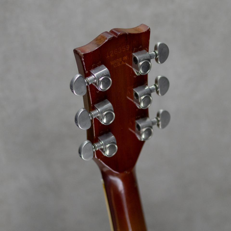 永遠にギタリストの憧れであり続け、エレキギターの王道ともいえるLes Paul Model。52~60年にかけて生産のオリジナルレスポールが廃盤となり、60年台ではSGモデルの生産へと転換。68年の再生産、最初のリイシューモデルを経た後、ミニハムバッカーの採用と共に”Deluxe”へとモデルチェンジをしました。その後Les Paul Deluxeは、工場の移転なども受け、各所に仕様変更がなされながら85年頃まで製造。本器は3ピースマホガニーネック、ボリュート付き3ピースメイプルトップ/積層構造("パンケーキ")ボディ、ゴールドリフレクターノブ...といったカラマズー工場最終期の1973年製。ずっしりとしたボディの重量感に堅牢な印象の構成。70's特有のフラットトップの真鍮サドルによる野太いピッキングレスポンスに、ミニハムバッカーの明るいアウトプットの組み合わせは唯一無二のキャラクター。70年代後期のよりタイトでかっちりとしたイメージに比べ、この時期はまだふくよかで暖かい古色のGibsonトーンを感じさせます。こちら経年相応に細かな打痕、小傷、ボディバックエッジ部分を中心に塗装の剥がれなどはあるものの、全体的に良い雰囲気で、顕著に外観の損なうダメージはございません。PU、ポットなど電装系はフルオリジナル。ペグはグローバーに交換済み。ポインターワッシャー2点が欠品しており2つはケースポケット内にございます。リフレットがされている為、各ポジション気持ちよく演奏していただけるコンディションで、現状ローアクションのセッティングでも抜群のプレイヤビリティ。ロッドの調整を含め良好なネックコンディションで即戦力に使っていただけるポテンシャルの一本。近年注目度の高まりが顕著なDeluxe、ぜひお見逃しなく。90年代のGibsonハードケースが付属。