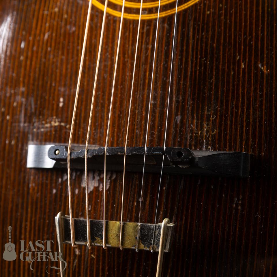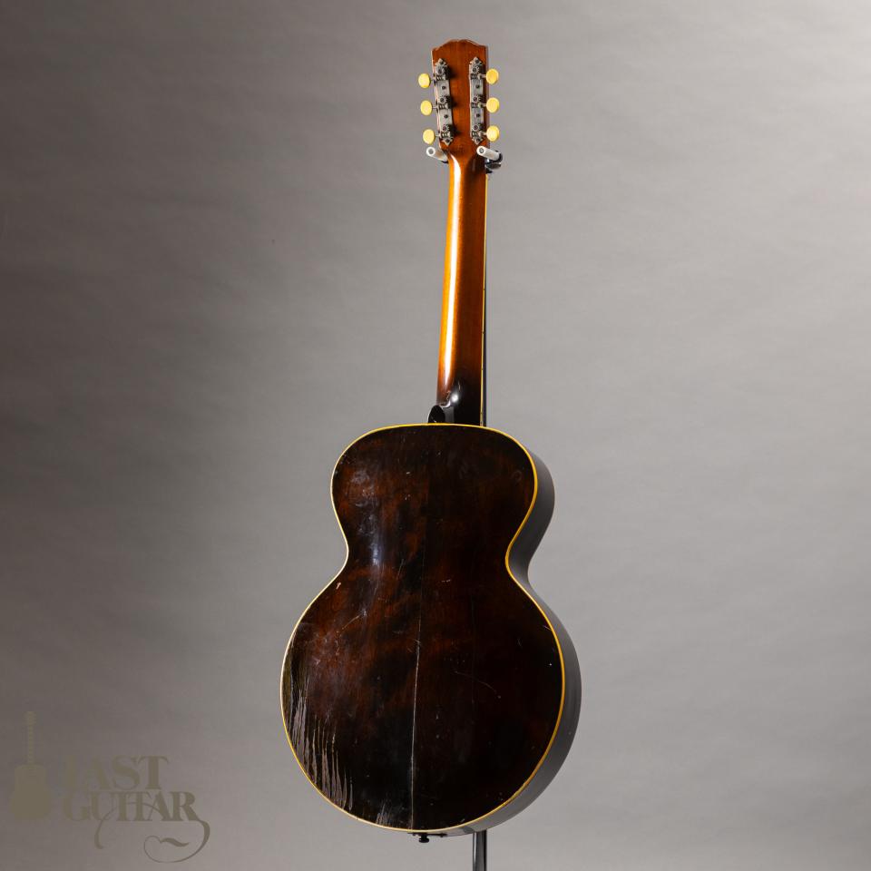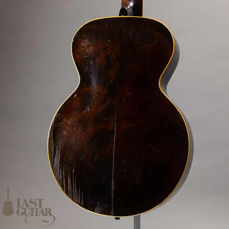 サウンドは、箱の鳴りがとても良く、独特のリバーブ感を持ち、ブルージーで何とも味わいがあります。プレーン弦でもしっかりとした太い音がしており、ヴォリューム豊かで、甘く枯れてとても良いフィーリングであります。また歯切れも良いですしスウィングなんかも良いと思います。その歴史を物語る素晴らしいサウンドは、プレイヤーを満足させてくれることでしょう。この年代の楽器としては、弦高も適正で演奏性も良好ですし、味のあるアーチトップをお探しのプレイヤーの方は、是非、お手に取ってお確かめいただければと思います。