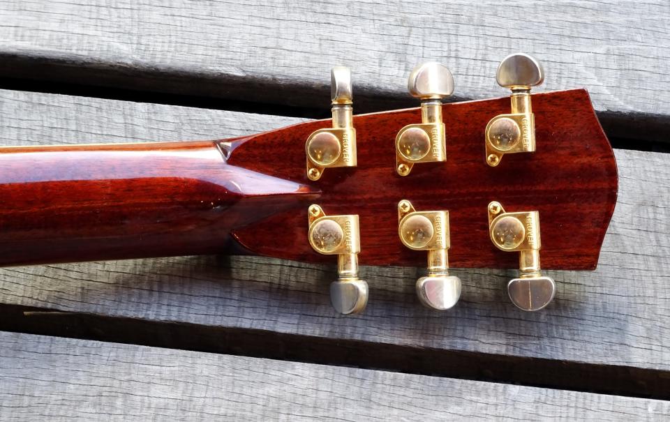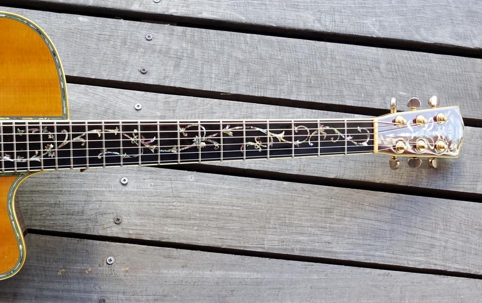 インレイ、バインディングはすべてアバロンが採用されていいます。グローバーペグがマウントされています。