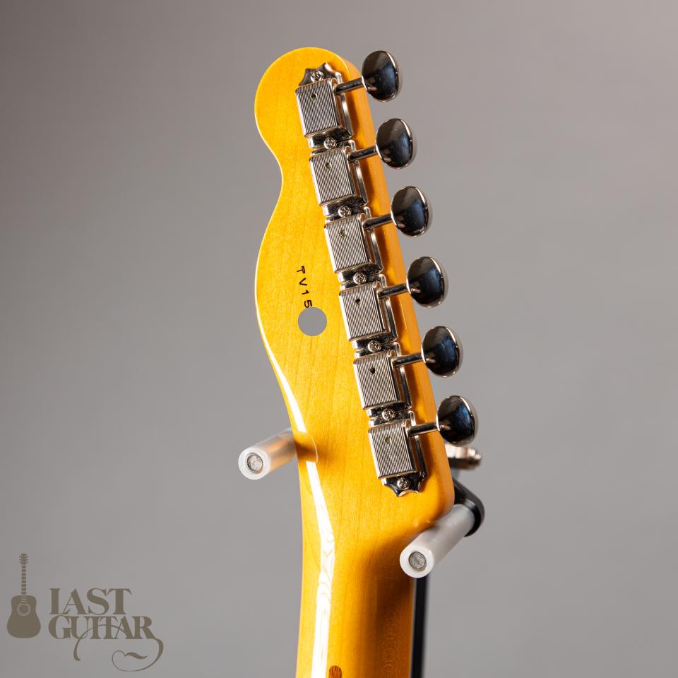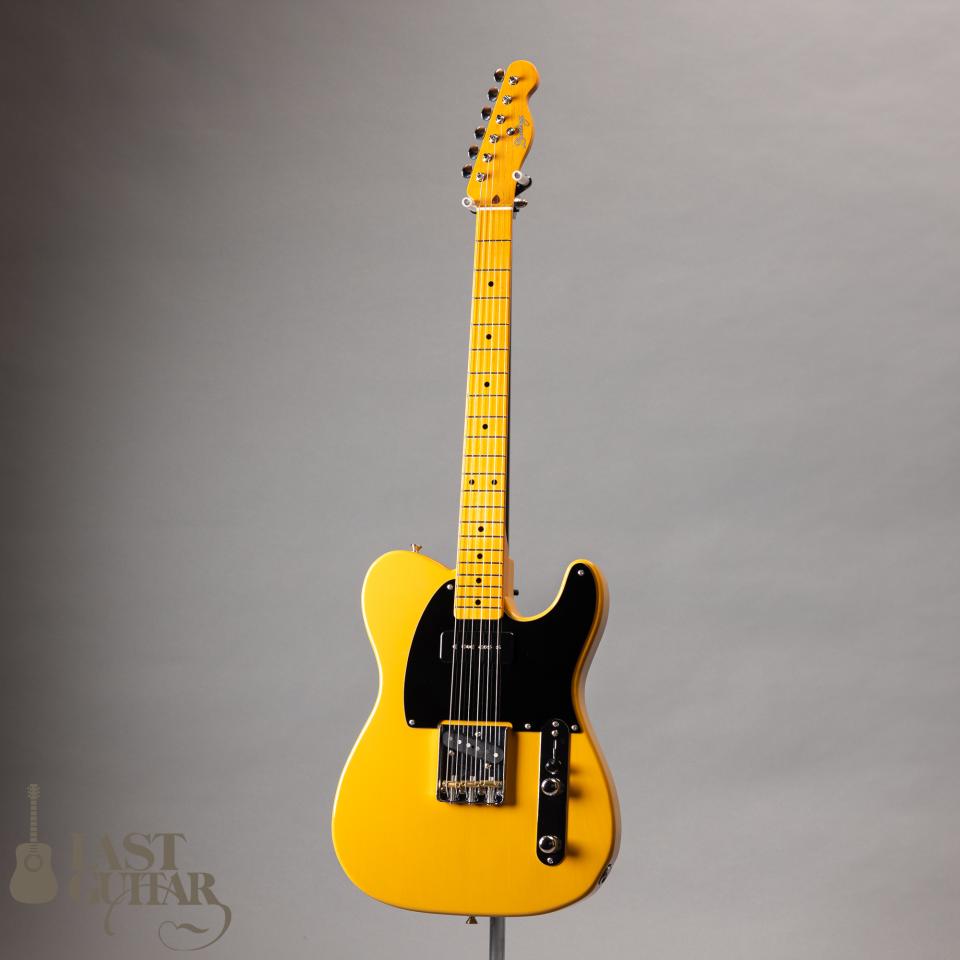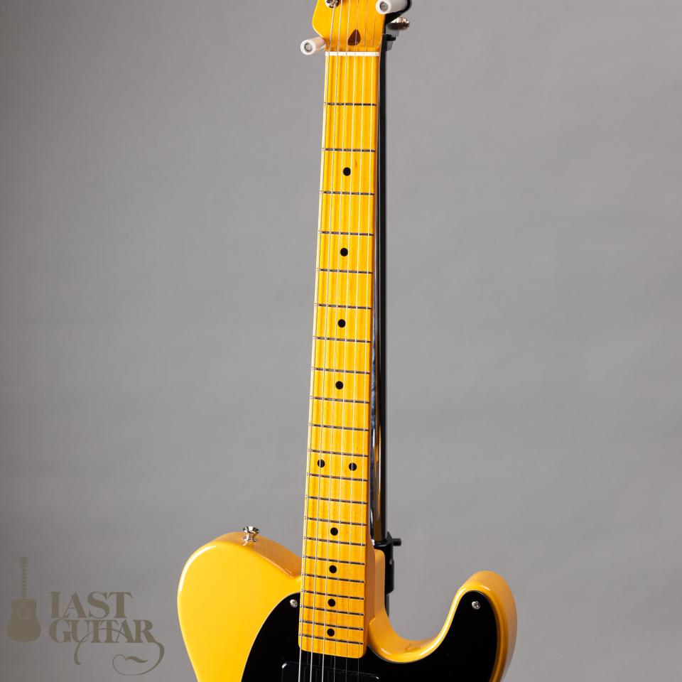 まずなんと言ってもボディーにライトアッシュ材を採用しておりウェイトが約3.1kgとソリッドギターとは思えないほど軽量です。ホロウボディーのギターを使用されている方でもストレスなく演奏をお楽しみいただけます。ルックスに関しましてはまろやかなバタースコッチブロンドカラー、ベークライト素材を使用した5点留めのブラックピックガード、メイプル指板、50年代を彷彿とさせるヴィンテージスタイルで当店のこだわりを詰め込んだルックスとなっております。塗装の質感も良く艶っとしたボディーにブラックガードがマッチしており非常にかっこ良いです。