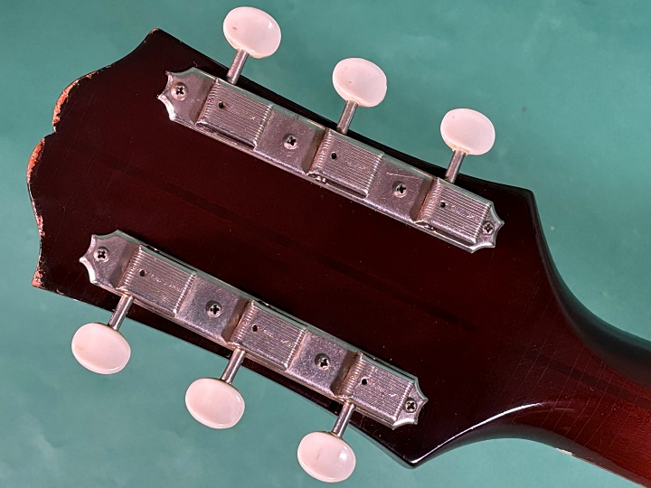 ペグはクルーソン3連に交換されており、ヘッドにはブッシュの痕があります。フリークエンセイター・スタイルのトラピーズ・テールピースに交換されております。ポット、コンデンサー、配線は交換されております。