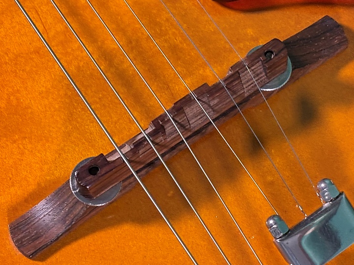 トップ、サイド、バックともにメイプル、ハカランダ指板、ハカランダアジャスタブルブリッジ、ピックアップはオリジナルのニューヨークPUです。