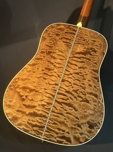 2017年に製作され、翌年のダラスギターショーに出展されたカスタムショップ製!アディロンダックスプルーストップ(スキャロップドブレイシング)に「天然の素材って凄いなぁ・・・」と溜息が出てしまう程に美しいキルテッドメイプルをサイド&バックに用いた14フレットジョイントのドレッドノート!