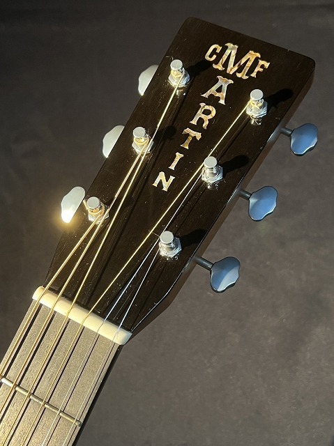 45 スタイルのロゼッタにヘッドプレートはアヴァロンのC.F Martinヴァーティカルロゴ。MOPのドットインレイにバインディングのないエボニー指板。カスタムオーダーモデルらしい組み合わせ。淡いシースルーブラウンにカラーリングされたサイド&バックは杢目の美しさを引き立てるのに貢献しています。