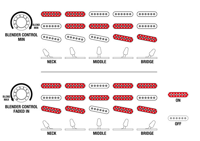 ジャック側のトーン・ノブの回し具合と5-Wayピックアップ・セレクターの位置を組み合わせることによって、ネック側またはブリッジ側ピックアップのミックス具合が調節可能で、演奏中でも手軽に操作でき、サウンドメイクの幅を広げます。