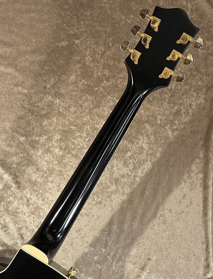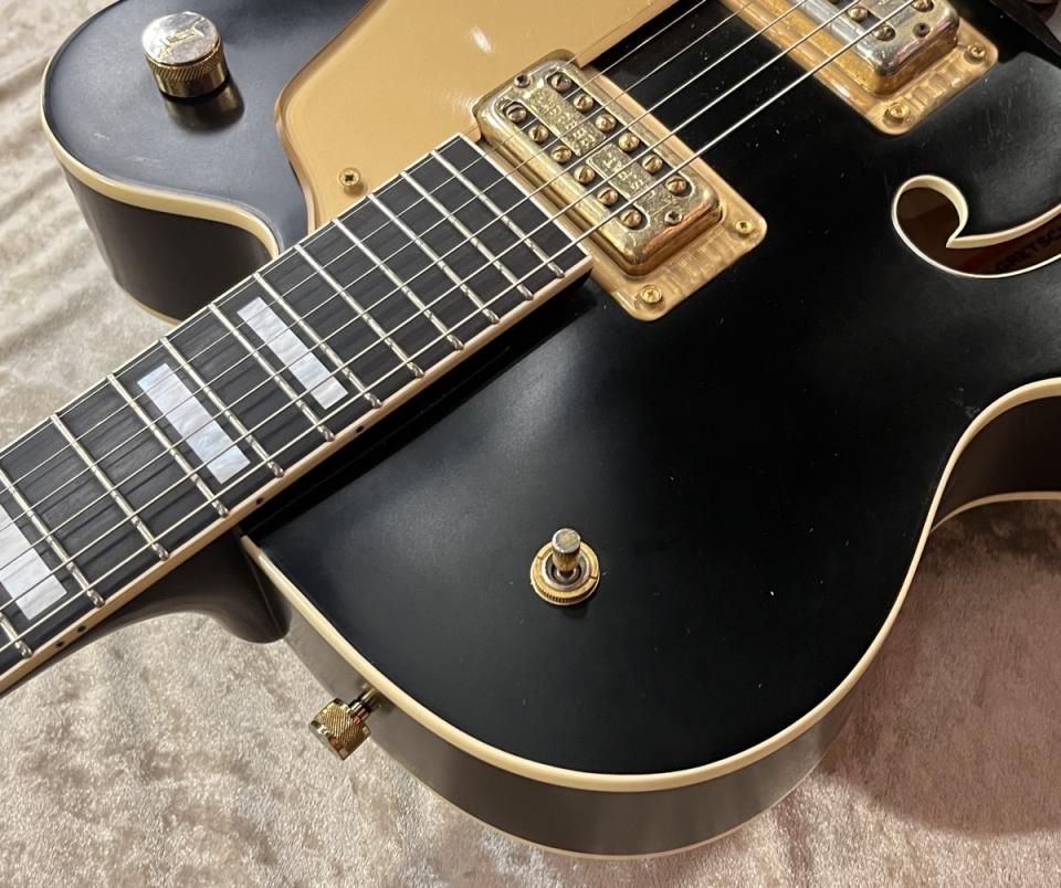 今回入荷した6120は2002年、日本製となります。6120と言えばオレンジのカラーがトレードマークですがこちらはマットブラックカラーです。おなじみのFilter'TronピックアップにBigsbyトレモロテールピース搭載。パーツ類はゴールドで統一されておりゴージャスな印象です。