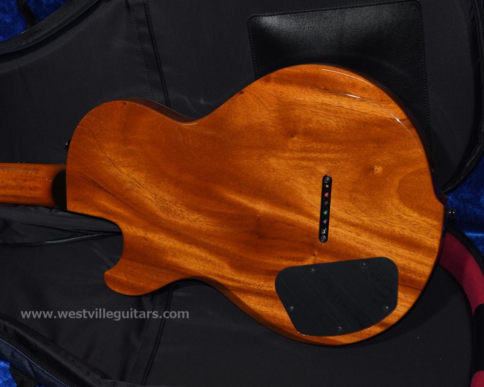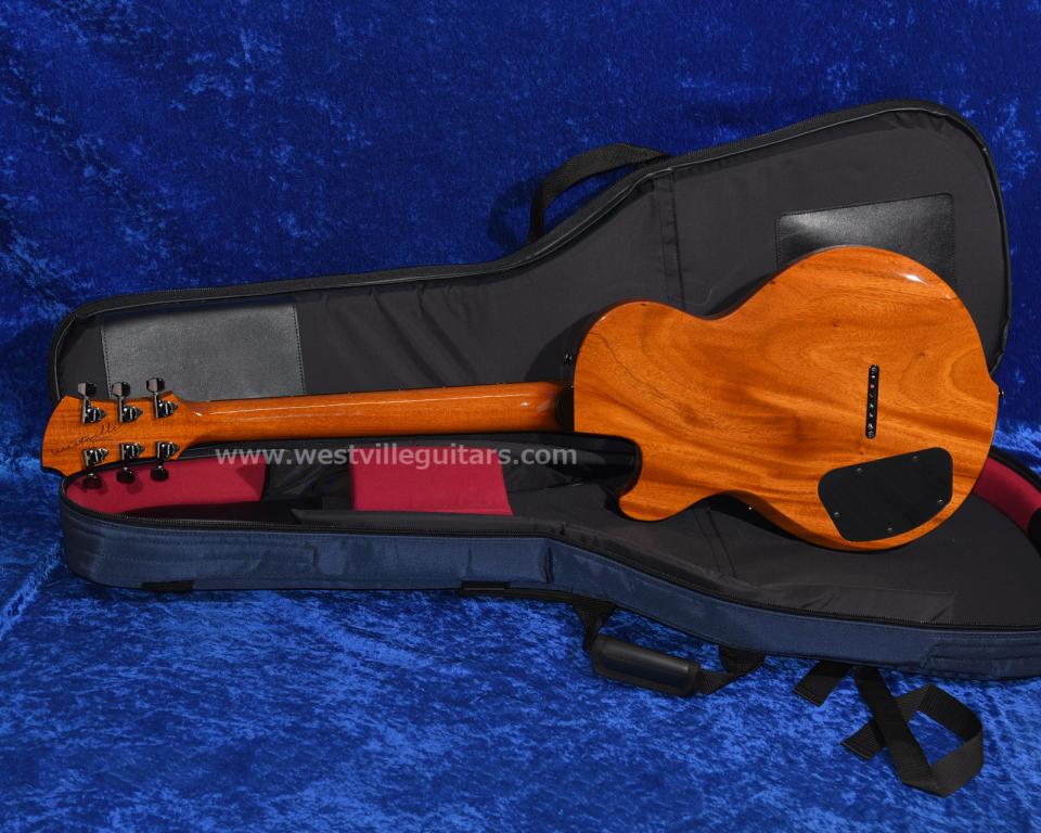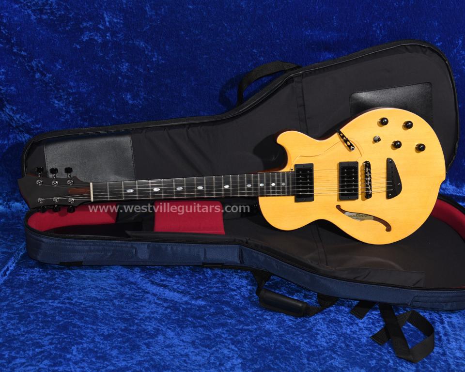 所謂レスポール・サイズのボディを持つセミソリッド・モデル「Sonny(サニー)」シリーズ。6弦側にのみWestvilleオリジナル・デザインのサウンドホールがレイアウトされた削り出しのボディトップには、フルアコ等に用いる分厚いシトカ・スプルース(Sonny S)、またはハードメイプル(Sonny M)をチョイス。ボディバックには良質な1ピースのホンデュラス・マホガニー材を用い、こちらはその両側に独自形状のチェンバー加工が施されております。