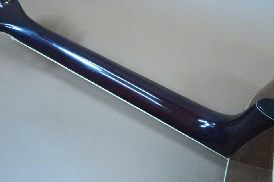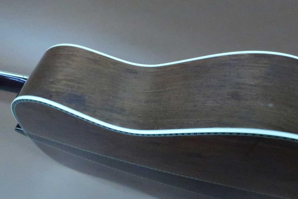 サウンドはタイトで腰の有る箱鳴りする低音と、輪郭の際立った音抜けとレスポンスの良い中域、繊細で煌びやかなガラスの割れた感じの『 シャリーン 』と響く倍音豊かな高音域も魅力で。強めのストロークでも音が潰れずグルーブ感があり、フィンガースタイルでは軽いタッチでも粒立ちが心地よい往年のヤマハ・サウンドです。状態は使用感も少なく、オリジナル・ペグの金属劣化も少なくまだ輝きを残しており、ヘッド周りも極小の打コン程度でとても綺麗で、トップも年代を考えれば日焼けも僅かで、傷や打コンもピックガードの僅かなスクラッチ傷ぐらいで光に翳して分かるぐらいの、ほぼ無傷かと思うぐらい綺麗です。サイド&バックも白濁なども見られず気になる傷や打コンは殆ど見受けられません。ネック裏も触って分かるぐらいの傷程度で演奏性も問題ありません。近年の中古市場で、ここまで綺麗なL-15は中々入手が難しいと思います。フレットも9分目程度は残っておりネックヒールのピン打やピックアップの取付、木部の割れやクラック修復歴もはありません。弦長651mm、ナット幅約43.5mm、弦高は12F6弦で約2.4mm、1弦約2mm、サドルの余裕も約2.5mm有り、トラスロッドも左右余裕も見られ、反りや元起も見受けられずネックを含めプレイヤビリティも良好です。懐かしいヤマハ・オリジナルハードケースも付属しています。中古市場でも玉数が少なく、状態の良い個体が年々減少しております。是非この機会にご検討を頂ければ幸いです。