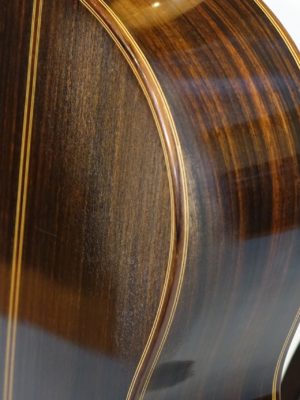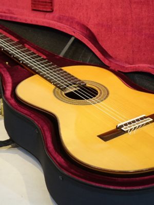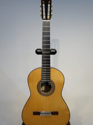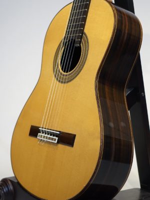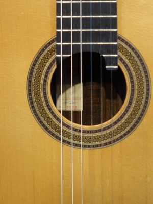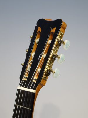 ヘッドデザインが特徴的ながら全体的には古典的なスペインギターの雰囲気の楽器です。ボディー下部のライン(ふくらみ)がやや細めなため見た目にトーレスを思い出されます。