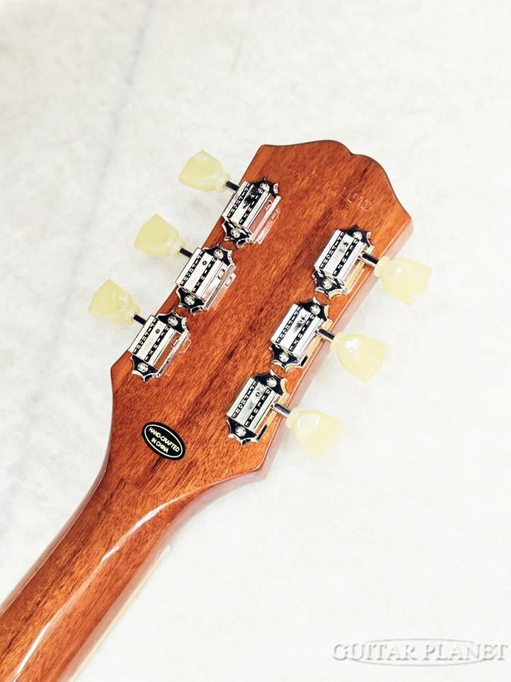 ボディ・トップにはメイプルが貼られ、1959ラウンド・ミディアム・Cシェイプのネックにはバインディングが巻かれロング・ネック・テノン方式でボディにジョイントされています。ローレル指板にはクラシカルなディッシュ・インレイが施され、22フレット仕様のミディアム・ジャンボ・フレットを採用。カラマズー・ヘッドストックにはヴィンテージ・デラックス・チューナーを搭載し、電装系には定評ある2基のProbuckerハムバッカー・ピックアップ、ダイヤル・ポインタ付きのゴールド・トップハット・ノブを採用。Graph Tech?ナット、CTSポット、往時の製法に則った配線など、拘りの仕様群により魅力が一層高められています。Epiphoneプレミアム・ギグバッグが付属となります。