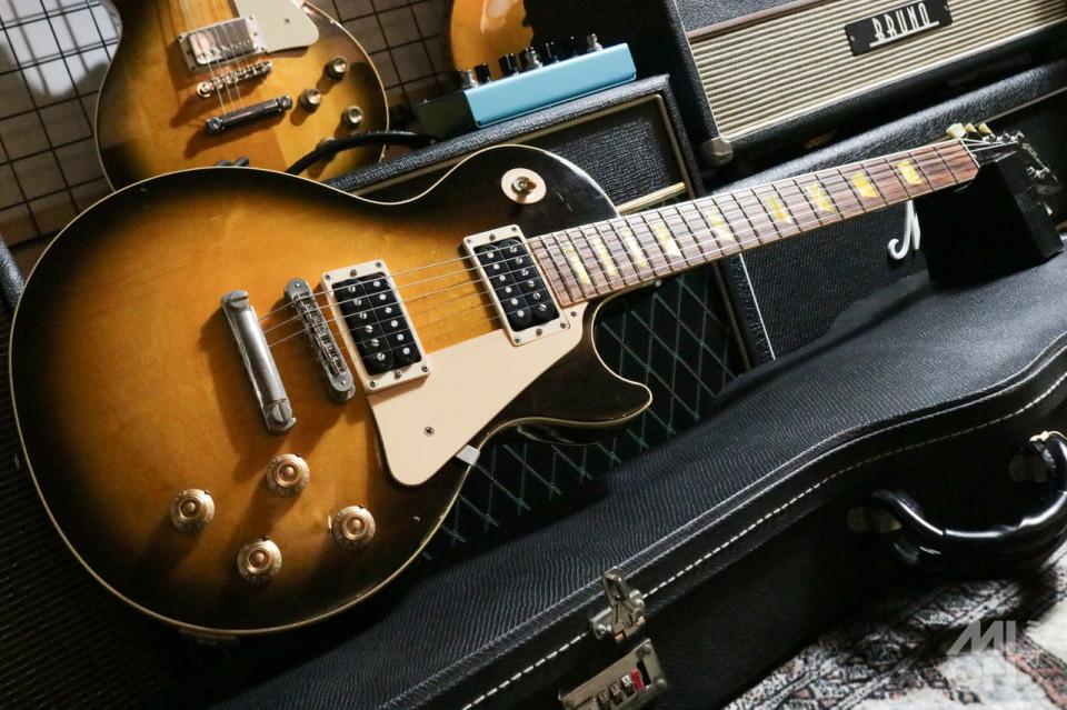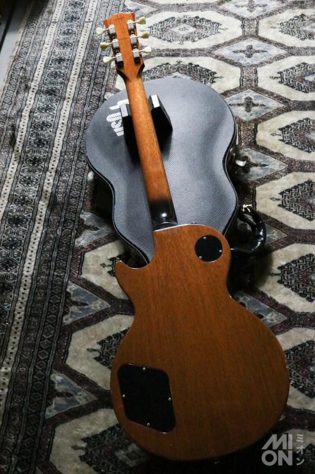 「クラシック」の名の通り、伝統的な仕様を踏襲。マホガニーバックにプレーン・メイプルトップ、60年製レスポールを意識した薄めのスリムテーパーマホガニーネック、そして黒々としたローズウッド指板という黄金期レスポールのウッドマテリアルを採用。クルーソンタイプのペグを搭載しています。インレイがかなり黄色くなっていて貫禄が出ています。1960と刻印されたピックガードも特徴。