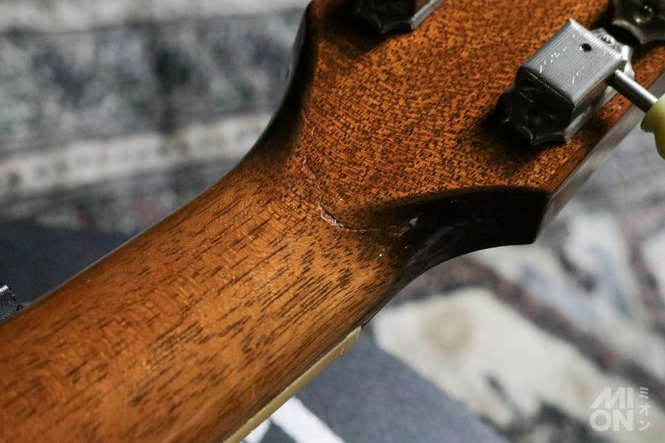 ここまでは普通のクラシックですが、このギターはヘッド折れの修正跡があります。突板まで折れていたため、当店でリペアいたしました。ボリュート部なども修正しておりますので、現在は特に演奏に支障はなく、通常使用出来ます。合わせてフレットもすり合わせしましたので、プレイアビリティは良好です。
