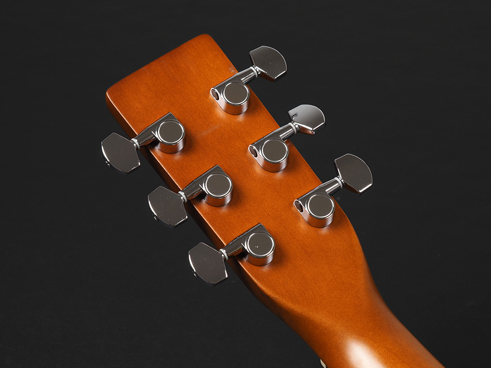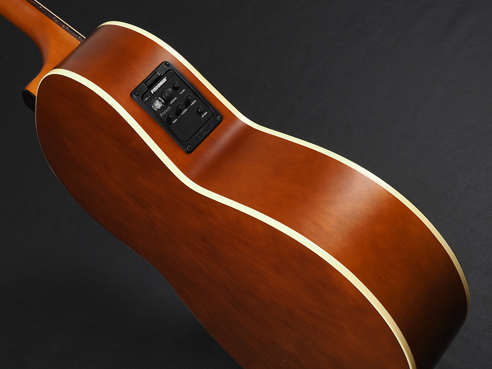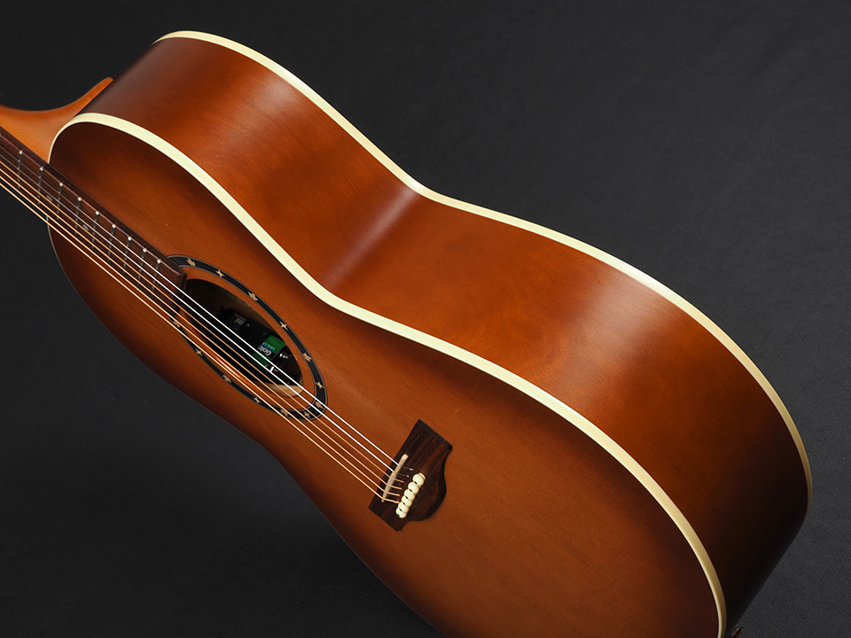ネックにはシルバーリーフメイプルを採用し、安定感のあるグリップとスムーズな演奏性を実現。インディアンローズウッド指板との組み合わせにより、フィンガースタイルからストロークまで幅広いプレイに対応します。
