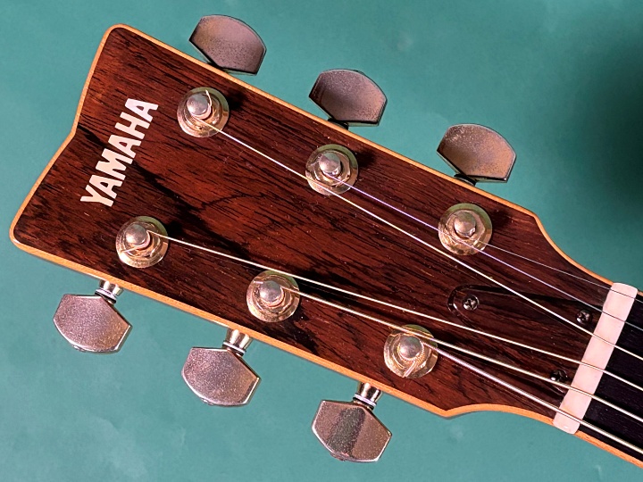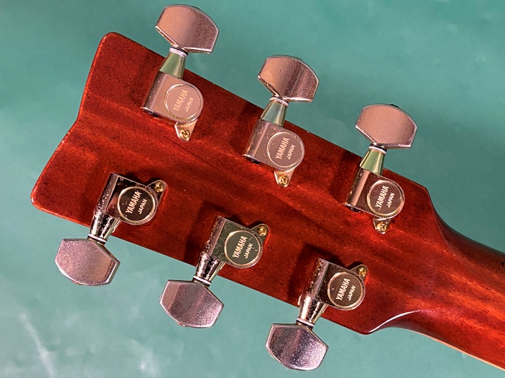 ペグはヤマハオリジナルのTM-57Gを搭載しており、くすみや若干のメッキ剥がれはあるものの、年式を考慮すれば輝きもあり非常にきれいな状態です。トップにはダークティンテッドカラーのフィニッシュが施され、ピックガードはオリジナルのクリアガードが取り付けられています。