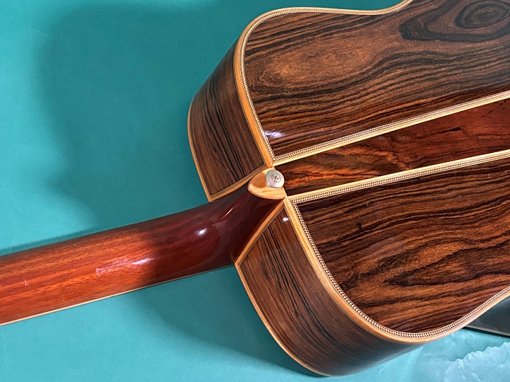 ルックスは派手なインレイも無くシンプルで、ヘリンボーンのボディバインディングとロゼッタリング、指板ポジションはドットポジションを採用。ボディサイドから指板サイド、ヘッドにかけてはメイプルのウッドバインディングが施され、ヘッドプレートとトラスロッドカバーにはハカランダが使用されています。