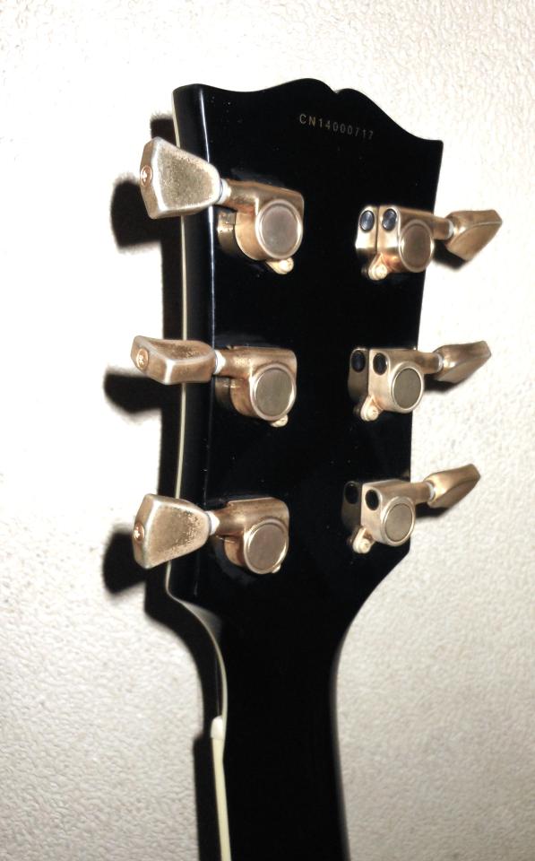 ハードケース付のブラックビューティー!ヘッドのインレイも独奏的に美しい1本です。ネック・フレットもOK!わずかにツヤ消しのゴールドパーツがおしゃれです。