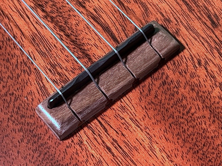 ボディバインディングにはマダガスカル・ローズウッドを使用し、指板とブリッジはローズウッド、ナット材はエボニー、サドルはブラックタスクです。