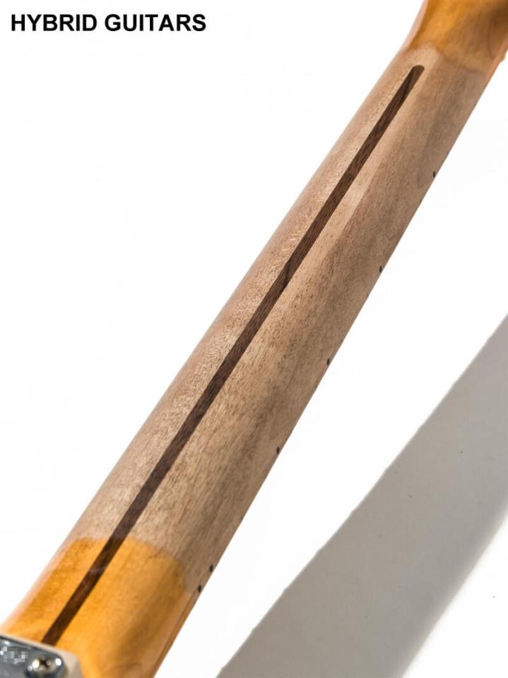 本機はボディにAsh、ネックにはQuartersawn Mapleを使用しています。指板はトラディショナルなTelecasterよりもフラットめな9.5inchラディアスにNarrow Jumboタイプのフレットですのでフィンガリングしやすいネックデザインとなっています。ピックアップはどちらもFender Custom ShopにてHand Woundされた58 Telecaster Setを搭載しています。