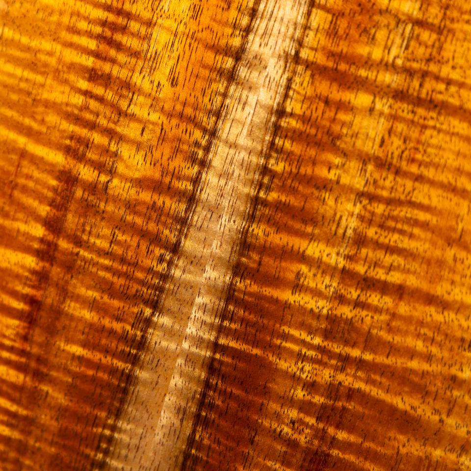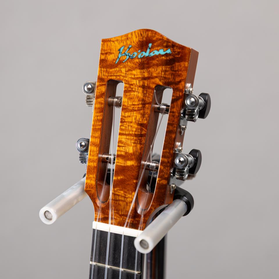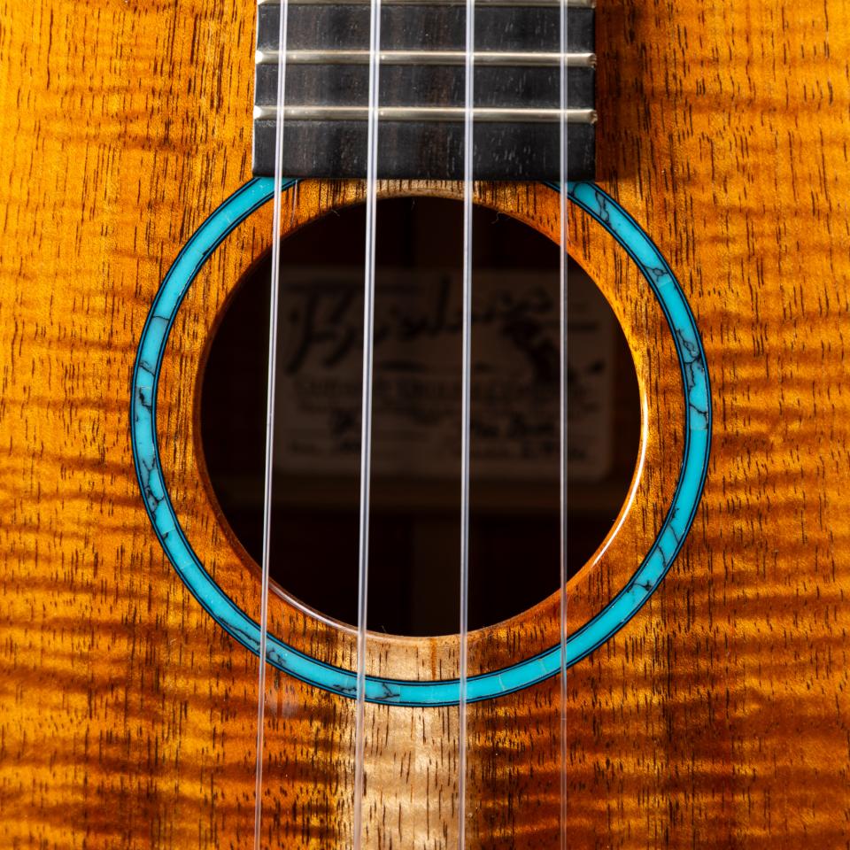 ボディには細かなカーリーが入り、白いサップ部分が目を惹く、最高級ハワイアンコアを贅沢に使用。ヘッドとロゼッタには美しい人工ターコイズが埋め込まれ、スロテッドヘッドには精度の高いGotoh製オリジナルペグを搭載しています。